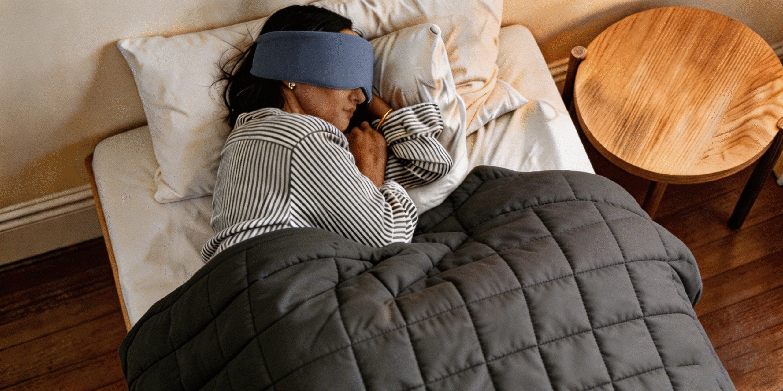 The weighted eye mask applies gentle pressure to reduce visual stimulation and ease anxiety